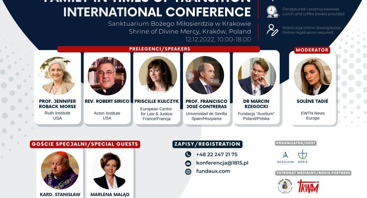 W imieniu Fundacji „Auxilium” z siedzibą w Tarnowie mamy przyjemność zaprosić Państwa do udziału w cyklu konferencji pn. „Rodzina w czasie zmian”, która odbędzie się w Sanktuarium Bożego Miłosierdzia w Krakowie-Łagiewnikach, w dniach 12-13 grudnia 2022 r.