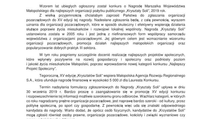 Pismo Członka Zarządu Województwa Małopolskiego – Pani Anny Pieczarki w sprawie naboru do konkursu o Nagrodę Marszałka Województwa Małopolskiego dla najlepszych organizacji prowadzących działalność pożytku publicznego Kryształy Soli”, edycja 2019. – pobierz PDF