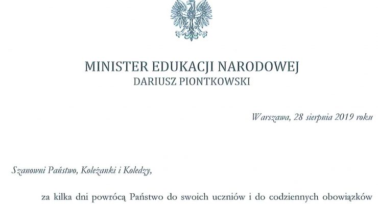 Warszawa, 28 sierpnia 2019 roku Szanowni Państwo, Koleżanki i Koledzy, za kilka dni powrócą Państwo do swoich uczniów i do codziennych obowiązków wytyczanych przez rytm roku szkolnego. Młodzi ludzie podejmą nowe wyzwania, ufni, że wsparcie z Państwa strony umożliwi im osiąganie sukcesów oraz pomoże w rozwiązywaniu trudnych sytuacji.
