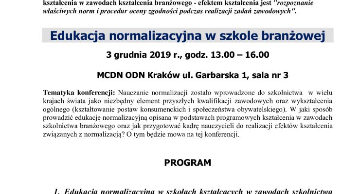 W dniu 3 grudnia Małopolskie Centrum Doskonalenia Nauczycieli Ośrodek w Krakowie oraz Polski Komitet Normalizacyjny zorganizowały konferencję adresowaną do dyrektorów, wicedyrektorów oraz nauczycieli szkół branżowych województwa małopolskiego pt. Edukacja normalizacyjna w szkole branżowej.