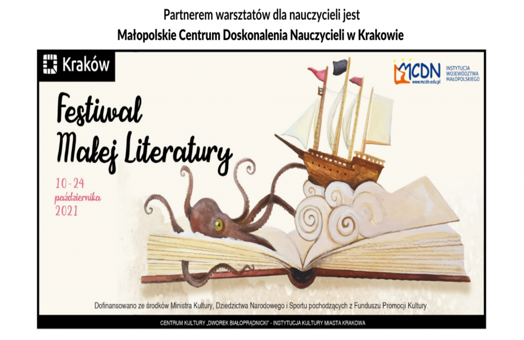 Festiwal Małej Literatury po raz pierwszy zaprasza małych, średnich i dużych czytelników w podróż w głąb książek. W ramach festiwalu odbędą się spotkania autorskie, warsztaty artystyczne, wystawa ilustracji, koncert Krakowskiego Chóru Dziecięcego. Włączając się w działania festiwalowe, w dniach 18-29 października zapraszamy wszystkich zainteresowanych nauczycieli na cykl spotkań warsztatowych oraz konferencję w ramach nowego wydarzenia na czytelniczej mapie Małopolski. Podczas spotkań online dla nauczycieli mowa będzie m.in. o terapeutycznej roli książek, rozmowach z dziećmi na niełatwe tematy oraz pomysłach na wykorzystanie bajek w pracy z dziećmi.