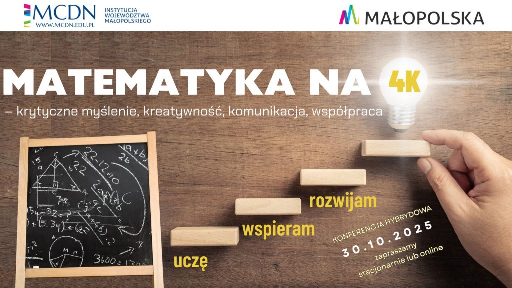 Zapraszamy nauczycieli matematyki wszystkich etapów edukacyjnych do udziału w bezpłatnej konferencji pt. „Matematyka na 4K – uczę, wspieram, rozwijam”, która odbędzie się w 30 października  br. w formule hybrydowej. Będzie to wyjątkowe spotkanie nauczycieli, którym zależy na tym, by lekcje matematyki były nie tylko poprawne merytorycznie, ale także angażujące, nowoczesne i pełne sensu dla ucznia.