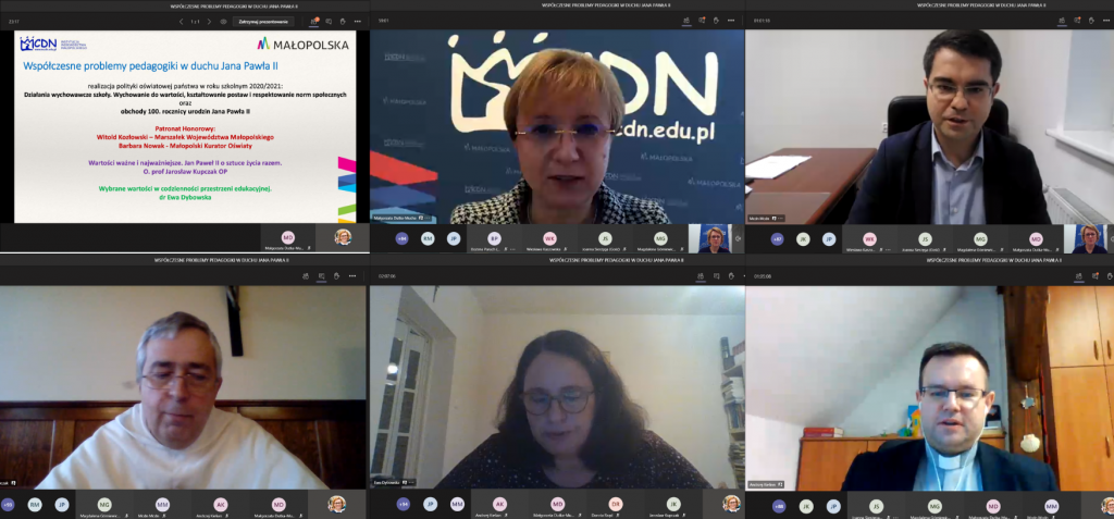 „Współczesne problemy pedagogiki w duchu Jana Pawła II” to tytuł konferencji online organizowanej przez Ośrodek w Krakowie przy współpracy z Wydziałem Katechetycznym Archidiecezji Krakowskiej. Problematyka konferencji ma podwójne znaczenie. Po pierwsze w 2020 roku przypadają obchody 100. rocznicy urodzin Jana Pawła II, po drugie poruszane zagadnienia wpisują się w wytyczne MEN w zakresie polityki oświatowej państwa. Działania wychowawcze szkoły, wychowanie do wartości, kształtowanie postaw i respektowanie norm społecznych to tematy szczególnie ważne i aktualne, które w swoich wystąpieniach poszerzyli nasi prelegenci.